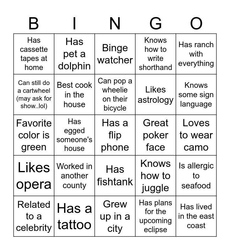This bingo card has 26 words: Has fishtank, Has plans for the upcoming eclipse, Can pop a wheelie on their bicycle, Has a tattoo, Has ranch with everything, Has cassette tapes at home, Can still do a cartwheel (may ask for show..lol), Has pet a dolphin, Loves to wear camo, Knows how to juggle, Likes astrology, Favorite color is green, Is allergic to seafood, Related to a celebrity, Has egged someone's house, Owns snowmobile, Knows how to write shorthand, Likes opera, Binge watcher, Has a flip phone, Knows some sign language, Grew up in a city, Great poker face, Worked in another county, Best cook in the house and Has lived in the east coast.