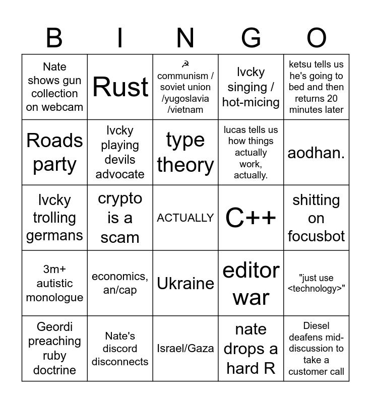 This bingo card has a free space and 24 words: economics, an/cap, Nate's discord disconnects, type theory, Geordi preaching ruby doctrine, ketsu tells us he's going to bed and then returns 20 minutes later, Nate shows gun collection on webcam, Roads party, Rust, C++, Ukraine, lucas tells us how things actually work, actually., lvcky trolling germans, editor war, "just use <technology>", lvcky playing devils advocate, nate drops a hard R, shitting on focusbot, ☭ communism / soviet union /yugoslavia /vietnam, aodhan., crypto is a scam, Diesel deafens mid-discussion to take a customer call, 3m+ autistic monologue, lvcky singing / hot-micing and Israel/Gaza.