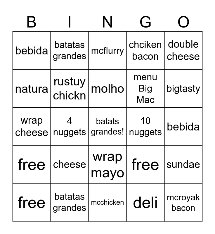 This bingo card has a free space and 24 words: cheese, batatas grandes, molho, free, double cheese, bebida, natura, batatas grandes, 10 nuggets, wrap mayo, menu Big Mac, wrap cheese, free, sundae, rustuy chickn, deli, bebida, mcflurry, bigtasty, 4 nuggets, mcroyak bacon, free, chciken bacon and mcchicken.