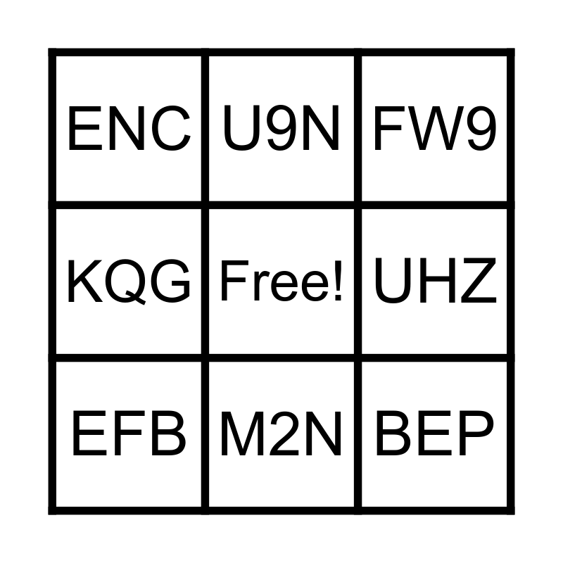 This bingo card has a free space and 8 words: UHZ, FW9, U9N, EFB, ENC, BEP, KQG and M2N.