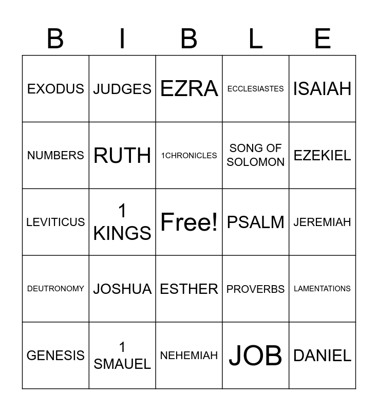 This bingo card has a free space and 24 words: GENESIS, JOSHUA, 1CHRONICLES, JOB, ISAIAH, EXODUS, JUDGES, EZRA, PSALM, JEREMIAH, LEVITICUS, RUTH, PROVERBS, LAMENTATIONS, NUMBERS, 1 SMAUEL, NEHEMIAH, ECCLESIASTES, EZEKIEL, DEUTRONOMY, 1 KINGS, ESTHER, SONG OF SOLOMON and DANIEL.