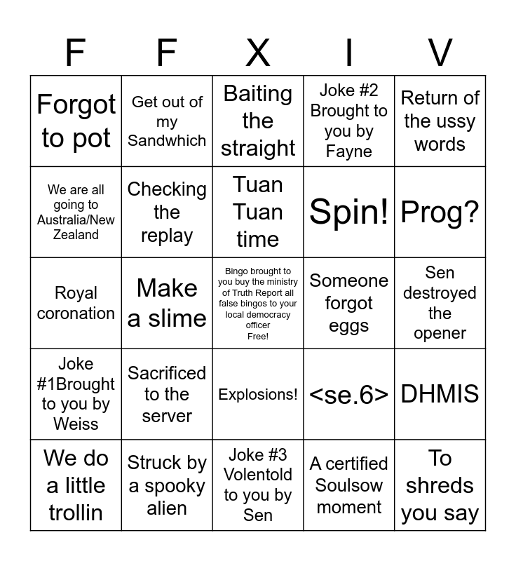 This bingo card has a free space and 24 words: Sacrificed to the server, Struck by a spooky alien, Tuan Tuan time, We do a little trollin, Return of the ussy words, Forgot to pot, We are all going to Australia/New Zealand, Get out of my Sandwhich, Someone forgot eggs, Explosions!, Spin!, Royal coronation, <se.6>, DHMIS, Checking the replay, A certified Soulsow moment, Sen destroyed the opener, Baiting the straight, Prog?, Make a slime, To shreds you say, Joke #1Brought to you by Weiss, Joke #2 Brought to you by Fayne and Joke #3 Volentold to you by Sen.