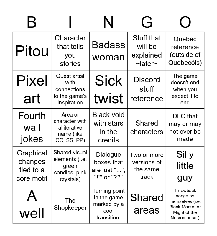 This bingo card has a free space and 24 words: Shared visual elements (i.e. green candles, pink crystals), The Shopkeeper, Sick twist, A well, Quebéc reference (outside of Quebecóis), Pitou, Pixel art, Character that tells you stories, Shared characters, Dialogue boxes that are just "...", "!!" or "??", Discord stuff reference, Fourth wall jokes, Two or more versions of the same track, Silly little guy, Guest artist with connections to the game's inspiration, Shared areas, DLC that may or may not ever be made, Badass woman, The game doesn't end when you expect it to end, Area or character with alliterative name (like CC, SS, PP), Throwback songs by themselves (i.e. Black Market or Might of the Necromancer), Graphical changes tied to a core motif, Stuff that will be explained ~later~ and Turning point in the game marked by a cool transition..
