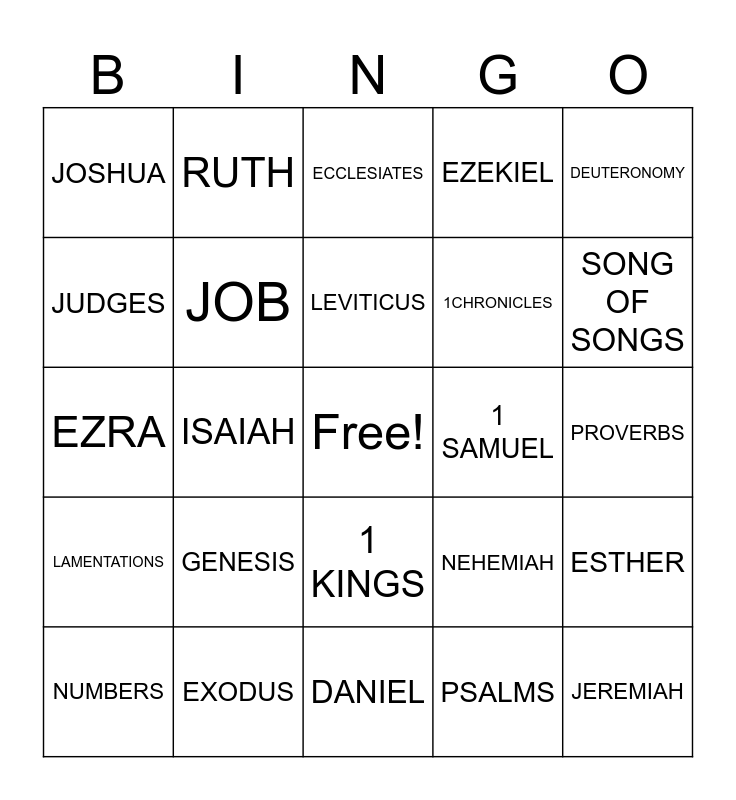 This bingo card has a free space and 24 words: GENESIS, EXODUS, LEVITICUS, NUMBERS, DEUTERONOMY, JOSHUA, JUDGES, RUTH, 1 SAMUEL, 1 KINGS, 1CHRONICLES, EZRA, NEHEMIAH, ESTHER, JOB, PSALMS, PROVERBS, ECCLESIATES, SONG OF SONGS, ISAIAH, JEREMIAH, LAMENTATIONS, EZEKIEL and DANIEL.