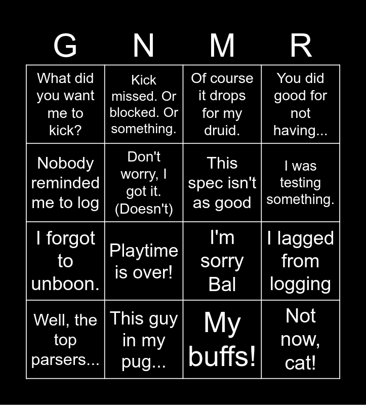 This bingo card has 16 words: This guy in my pug..., I lagged from logging, Of course it drops for my druid., What did you want me to kick?, I forgot to unboon., Kick missed. Or blocked. Or something., I'm sorry Bal, My buffs!, Nobody reminded me to log, Don't worry, I got it. (Doesn't), Well, the top parsers..., You did good for not having..., Playtime is over!, I was testing something., This spec isn't as good and Not now, cat!.