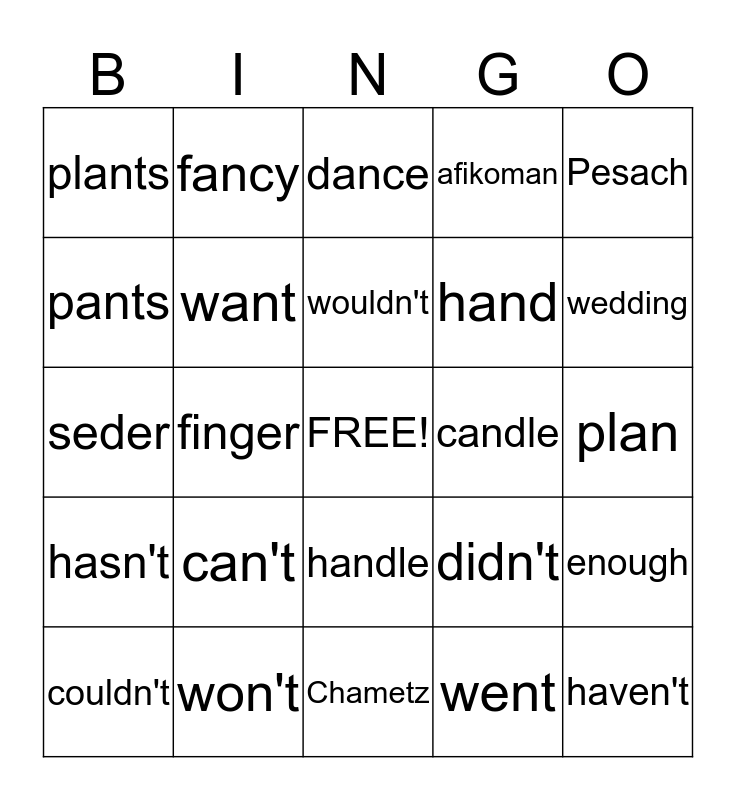 This bingo card has a free space and 24 words: can't, won't, wouldn't, couldn't, Pesach, plants, pants, fancy, candle, handle, hand, seder, didn't, enough, want, went, plan, dance, wedding, finger, haven't, hasn't, afikoman and Chametz.