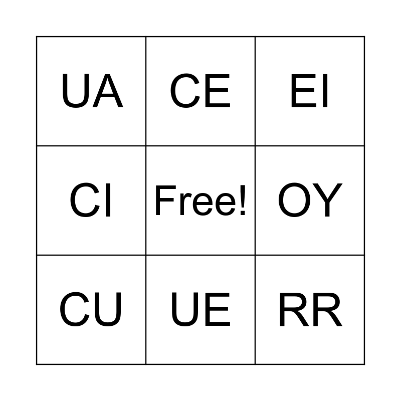 This bingo card has a free space and 14 words: CA, CO, CU, CE, CI, RR, IA, IO, UE, UA, AU, OY, EI and IE.