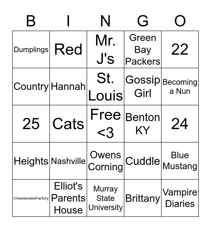 This bingo card has a free space and 24 words: Nashville, Elliot's Parents House, St. Louis, CheesecakeFactory, 22, Dumplings, Country, Red, Benton KY, Owens Corning, Gossip Girl, 25, Cuddle, Blue Mustang, Hannah, Brittany, 24, Mr. J's, Becoming a Nun, Cats, Vampire Diaries, Heights, Green Bay Packers and Murray State University.