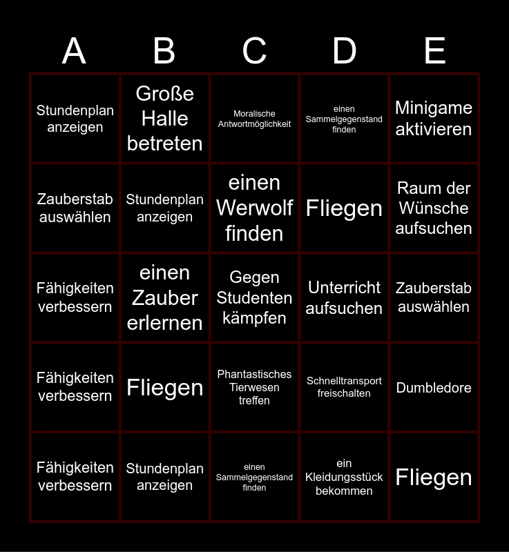 ⚠ This card has duplicate items: Phantastisches Tierwesen treffen (3), Moralische Antwortmöglichkeit (3), einen Trank herstellen (3), Bekannter Name erwähnt (3), Mit Wandbilder interagieren (3), Dunklen Zauber wirken (3), Schach spielen (3), Schnelltransport freischalten (3), Raum der Wünsche aufsuchen (3), Fliegen (3), mit Haus-Elf sprechen (3), einen Werwolf finden (3), Zauberstab auswählen (3), ein Kleidungsstück bekommen (3), einen Zauber erlernen (3), Unterricht aufsuchen (3), Gegen Studenten kämpfen (3), Hogsmead besuchen (3), Minigame aktivieren (3), Dumbledore (3), Fähigkeiten verbessern (3), Stundenplan anzeigen (3), Große Halle betreten (3), einen Sammelgegenstand finden (3), mit Natur interagieren (3)