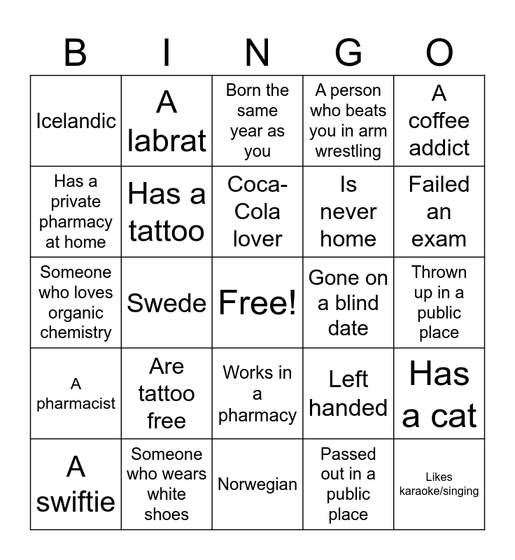 This bingo card has a free space and 31 words: Norwegian, Dane, Swede, Finnish, Icelandic, Born the same year as you, Has a tattoo, Left handed, Gone on a blind date, Passed out in a public place, Thrown up in a public place, Likes karaoke/singing, Eaten snails, This is their first Pinsestævne, Failed an exam, Has a dog, Has a cat, Are tattoo free, A pharmacist, Works in a pharmacy, A coffee addict, A non coffee drinker, A swiftie, A labrat, Is never home, Has a private pharmacy at home, A person who beats you in arm wrestling, Someone who loves organic chemistry, Someone who wears white shoes, Coca-Cola lover and Is excited for Pinse.