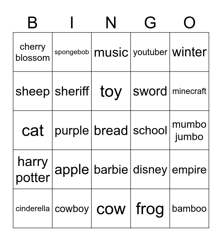 This bingo card has 25 words: apple, cow, toy, cinderella, winter, cherry blossom, sheep, spongebob, school, barbie, sword, cat, disney, empire, sheriff, bamboo, mumbo jumbo, music, minecraft, purple, bread, cowboy, harry potter, youtuber and frog.