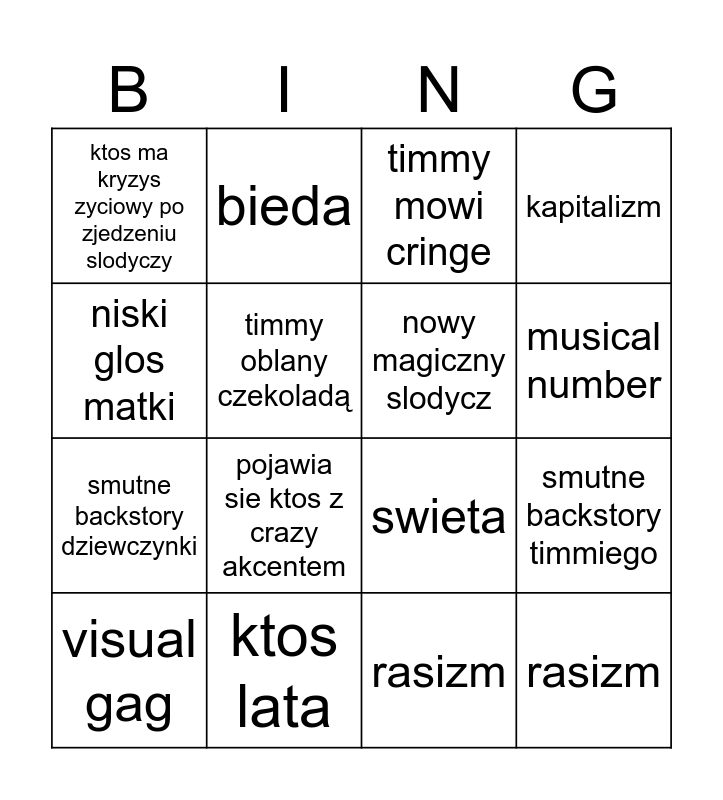 This bingo card has 17 words: rasizm, visual gag, timmy mowi cringe, ktos ma kryzys zyciowy po zjedzeniu slodyczy, pojawia sie ktos z crazy akcentem, kapitalizm, smutne backstory timmiego, nowy magiczny slodycz, musical number, timmy oblany czekoladą, ktos lata, swieta, niski glos matki, bieda, smutne backstory dziewczynki, pies and rasizm.