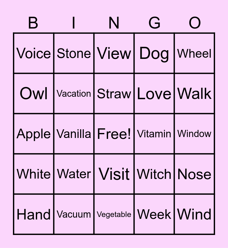 This bingo card has a free space and 30 words: Vacuum, Vase, Vanilla, Vet, Voice, View, Vacation, Visit, Vitamin, Vegetable, Window, Wind, Week, Wall, Walk, Wife, Witch, White, Water, Wheel, Apple, Juice, Stone, Love, Owl, Dog, Nose, Hand, Straw and Flower.