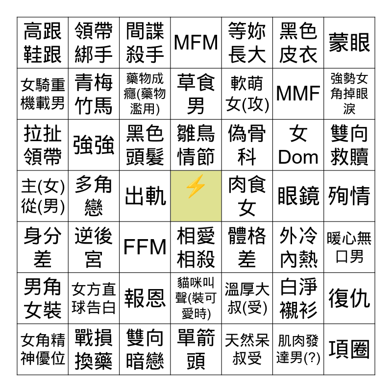 This bingo card has a free space and 48 words: 溫厚大叔(受), MMF, 單箭頭, 多角戀, 黑色頭髮, 殉情, 領帶綁手, 戰損換藥, 黑色皮衣, 相愛相殺, 蒙眼, MFM, 女Dom, 偽骨科, 男角女裝, 眼鏡, 女騎重機載男, 強勢女角掉眼淚, 白淨襯衫, 等妳長大, 軟萌女(攻), 出軌, 高跟鞋跟, 青梅竹馬, 復仇, 藥物成癮(藥物濫用), 雙向救贖, 女角精神優位, 雛鳥情節, 強強, 肌肉發達男(?), 肉食女, 暖心無口男, 女方直球告白, 主(女) 從(男), 體格差, 外冷內熱, 拉扯領帶, FFM, 報恩, 身分差, 項圈, 間諜殺手, 雙向暗戀, 草食男, 貓咪叫聲(裝可愛時), 逆後宮 and 天然呆叔受.