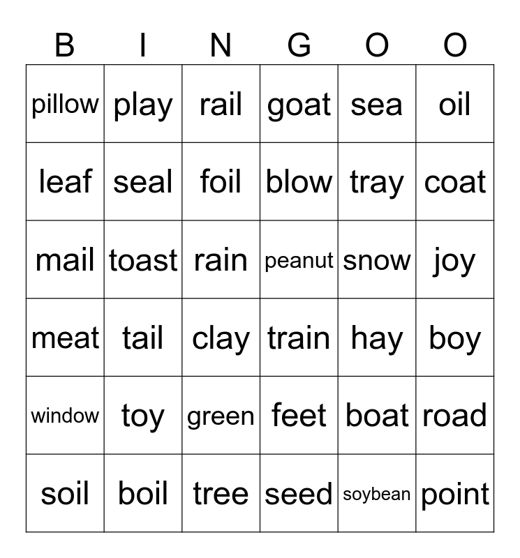 This bingo card has 36 words: feet, green, seed, leaf, meat, peanut, seal, tree, sea, boat, coat, goat, road, toast, blow, pillow, window, snow, mail, rail, rain, tail, train, clay, hay, play, tray, boil, foil, oil, point, soil, boy, joy, toy and soybean.
