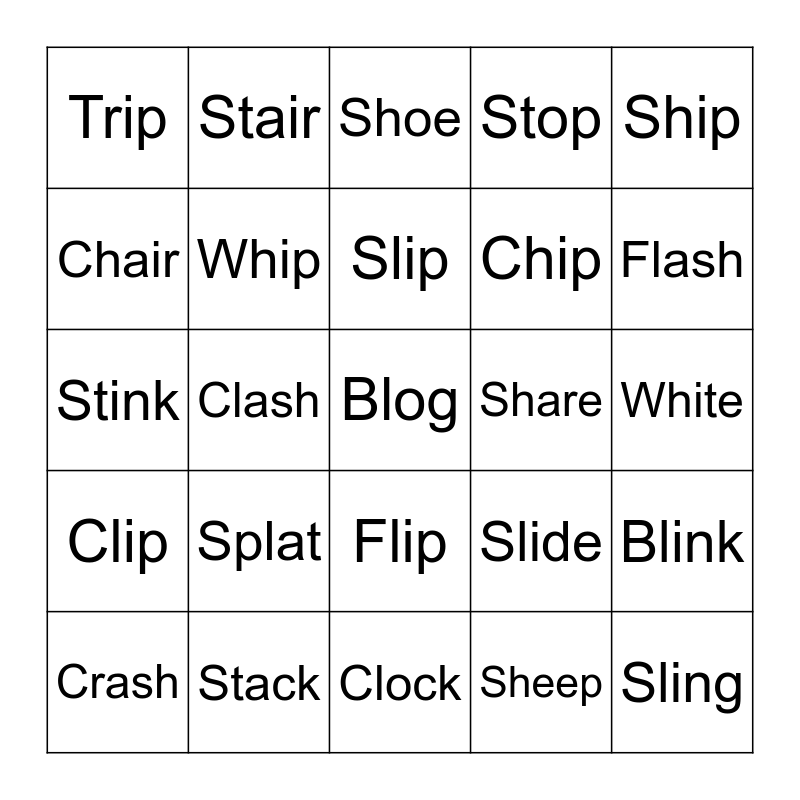 This bingo card has a free space and 24 words: Splat, Stack, Slip, Crash, Ship, Trip, Chair, Stair, Share, Flip, Chip, Stink, Slide, Blink, Whip, Sheep, White, Shoe, Flash, Clash, Sling, Clip, Stop and Clock.