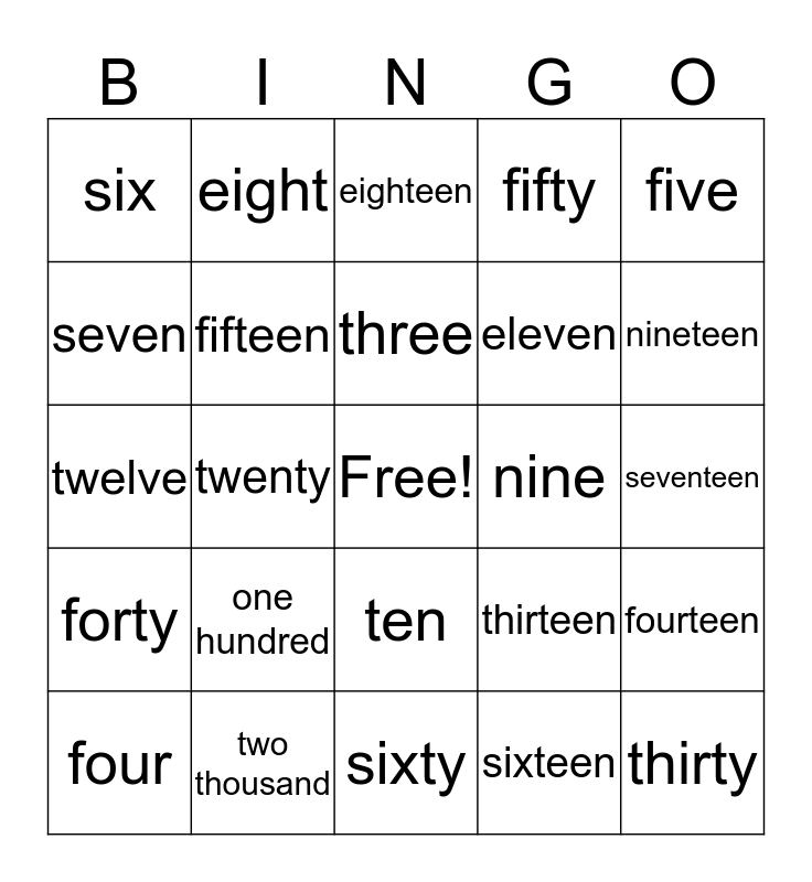 This bingo card has a free space and 24 words: one hundred, two thousand, three, four, five, six, seven, eight, nine, ten, eleven, twelve, thirteen, fourteen, fifteen, sixteen, seventeen, eighteen, nineteen, twenty, thirty, forty, fifty and sixty.