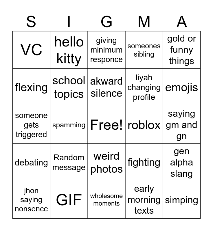 This bingo card has a free space and 24 words: Random message, GIF, akward silence, jhon saying nonsence, gold or funny things, VC, flexing, hello kitty, roblox, weird photos, liyah changing profile, someone gets triggered, fighting, gen alpha slang, school topics, early morning texts, saying gm and gn, giving minimum responce, emojis, spamming, simping, debating, someones sibling and wholesome moments.