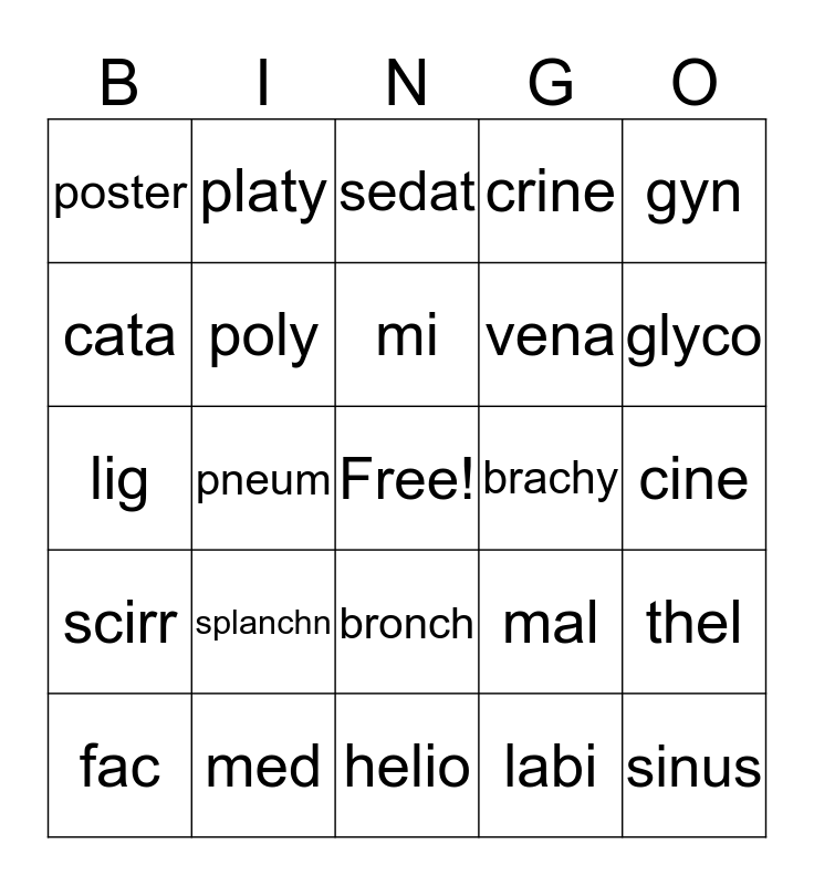 This bingo card has a free space and 24 words: splanchn, med, mi, fac, gyn, poster, cata, platy, brachy, bronch, vena, lig, mal, thel, poly, labi, cine, sedat, glyco, pneum, sinus, scirr, crine and helio.