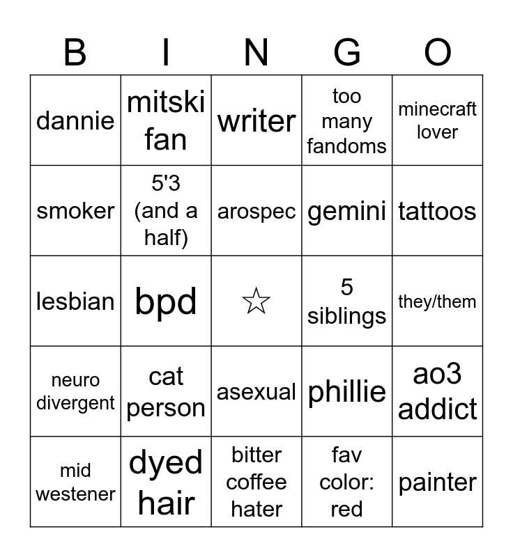 This bingo card has a free space and 24 words: cat person, dyed hair, arospec, mid westener, minecraft lover, dannie, smoker, mitski fan, 5 siblings, asexual, gemini, lesbian, phillie, ao3 addict, 5'3 (and a half), fav color: red, they/them, writer, tattoos, bpd, painter, neuro divergent, too many fandoms and bitter coffee hater.