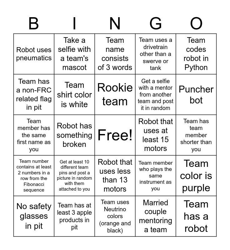 This bingo card has a free space and 36 words: Team Number is Prime, Someone with a birthday within 1 day of you, Sponsored by Google, Apple, or Microsoft, Team shirt color is white, Team member who plays the same instrument as you, Team number contains at least 2 numbers in a row from the Fibonacci sequence, Rookie team, Team color is Yellow, Team codes robot in Python, Team has 3 main colors, Robot has something broken, Team uses a drivetrain other than a swerve or tank, Team has a team member taller than you, Robot that uses at least 15 motors, Puncher bot, Robot uses pneumatics, Walk in front of a pit and dab, Get at least 10 different team pins and post a picture in random with them attached to you, Team has a robot, Team name consists of 3 words, Team has team member shorter than you, Team color is purple, Team has at least 3 apple products in pit, No safety glasses in pit, Team uses Neutrino colors (orange and black), Take a selfie with a team's mascot, Team member has the same first name as you, Team has 3d printer in pit, Get a selfie with a mentor from another team and post it in random, Team has a non-FRC related flag in pit, Team number starts with 1, Team from at least 250 miles away, Married couple mentoring a team, Robot that uses less than 13 motors, Get at least 35 high fives and Three digit team number.
