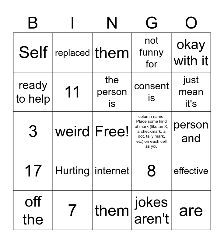 This bingo card has a free space and 110 words: Call List, Use this randomly generated list as your call list when playing the game. There is no need to say the BINGO, column name. Place some kind of mark (like an X, a checkmark, a dot, tally mark, etc) on each cell as you, announce it, to keep track. You can also cut out each item, place them in a bag and pull words from the bag., 1, Android, vs Apple, debate is, annoying, 2, Narcissistic,, psychotic,, psychopathic,, autistic, and, bipolar, shouldn't, be insults, 3, Trigger, warnings, aren't, effective, 4, KYS jokes, really aren't, funny unless, the person is, okay with it, 5, Bullying kids, on roblox is, just mean it's, not funny for, them, 6, Little kids, are, humans, too, 7, Sexualizing, real people, without, consent is, weird, 8, Mental, health days, should, exist, 9, The, fentanyl, jokes aren't, funny, 10, Hating on, someone's, music taste, isn't cool, 11, Self, diagnosis, CAN be, harmful, 12, Hurting, animals, for fun is, sick, 13, She/He, should be, replaced, with "them", 14, You can't, look at a, person and, know if they, have an ED, 15, Ghosting, people without, explanation is, a horrible thing, to do, 16, Young kids, shouldn't have, pets unless the, parents are, ready to help, out, 17, People need to, recognize that, listening to, problematic, artists supports, them, 18, Keep, young kids, off the, internet, 19, Billionaires, aren't, good and people.