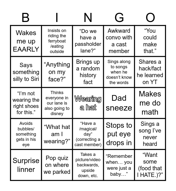 This bingo card has a free space and 44 words: “Look at the pretty flowers.”, “Want some (food that I HATE.)?”, “At least its not too busy today” (in denial), Surprise linner, Mentions the Disney bubble, “Remember when… you were just a baby…”, “Do we have a passholder lane?”, “Is there anything in my teeth?”, “You could make that.”, Pop quiz on where we parked, Awkward convo with a cast member, Dad sneeze, “Have a /magical/ day” (correcting a cast member), “What hat am I wearing?”, “Well… we’re on vacation.”, Takes a picture/video backwards, upside down, etc., Mentions a conspiracy theory, “I’m not wearing the right shoes for this.”, Packs an item of clothing in my bag, Shares a hack/fact he learned on YT, Insists on riding the ferryboat /eating outside, “It’s a nice day for ____!”, “It’s the humidity that gets ya”, Wakes me up EAARLY, Holds my water bottle for a bit w/o noticing, Makes me do math, Dad joke, Bumps into someone, Stops to put eye drops in, Avoids bubbles/ something gets in his eye, “We’re movin’!”, Sings a song I’ve never heard, Teaches me a word I’ve never heard, Mentions in/out of “season”, Thinks everyone in our lane is also going to disney, Reading license plates, “That should be illegal.” (About loud music or engine), Tapping the steering wheel, Brings up a random history fact, Says something silly to Siri, Sings along to songs when he doesn’t know the words, Snarky “really?”, “Anything on my face?” and “We gotta merge”.