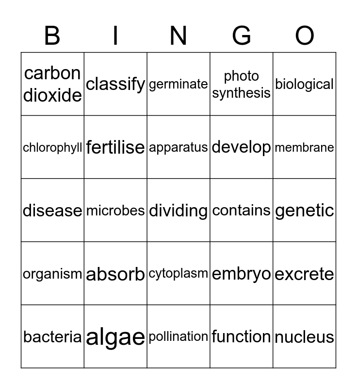 This bingo card has a free space and 24 words: absorb, algae, apparatus, bacteria, biological, carbon dioxide, chlorophyll, classify, contains, cytoplasm, develop, disease, embryo, excrete, fertilise, function, genetic, germinate, membrane, microbes, nucleus, organism, photo synthesis and pollination.