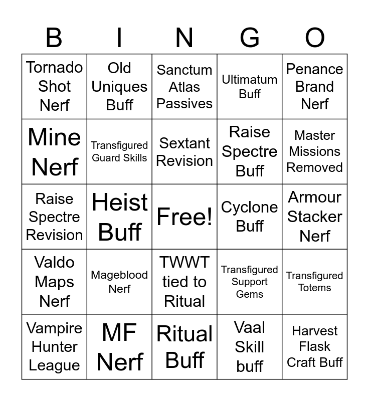This bingo card has a free space and 24 words: Mageblood Nerf, MF Nerf, Sextant Revision, Vampire Hunter League, Penance Brand Nerf, Tornado Shot Nerf, Mine Nerf, Old Uniques Buff, Cyclone Buff, TWWT tied to Ritual, Raise Spectre Buff, Raise Spectre Revision, Transfigured Support Gems, Transfigured Totems, Transfigured Guard Skills, Vaal Skill buff, Armour Stacker Nerf, Sanctum Atlas Passives, Master Missions Removed, Heist Buff, Harvest Flask Craft Buff, Valdo Maps Nerf, Ultimatum Buff and Ritual Buff.