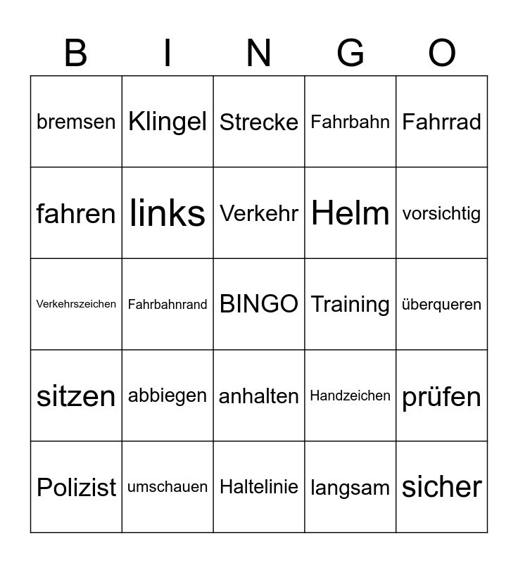 This bingo card has a free space and 24 words: Polizist, abbiegen, Verkehr, langsam, Fahrrad, bremsen, Klingel, Strecke, Training, überqueren, Verkehrszeichen, links, Handzeichen, prüfen, fahren, umschauen, Haltelinie, Fahrbahn, vorsichtig, sitzen, Fahrbahnrand, anhalten, Helm and sicher.