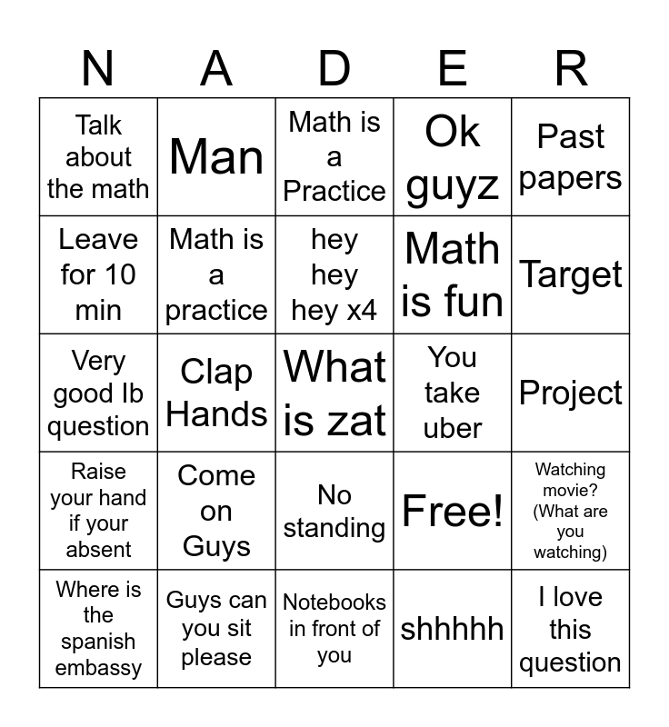 This bingo card has 25 words: Come on Guys, Notebooks in front of you, hey hey hey x4, Where is the spanish embassy, Past papers, Talk about the math, Leave for 10 min, Man, You take uber, No standing, Math is fun, Very good Ib question, Free!, Watching movie?(What are you watching), Math is a practice, I love this question, Project, Math is a Practice, Target, Clap Hands, What is zat, Guys can you sit please, Raise your hand if your absent, Ok guyz and shhhhh.