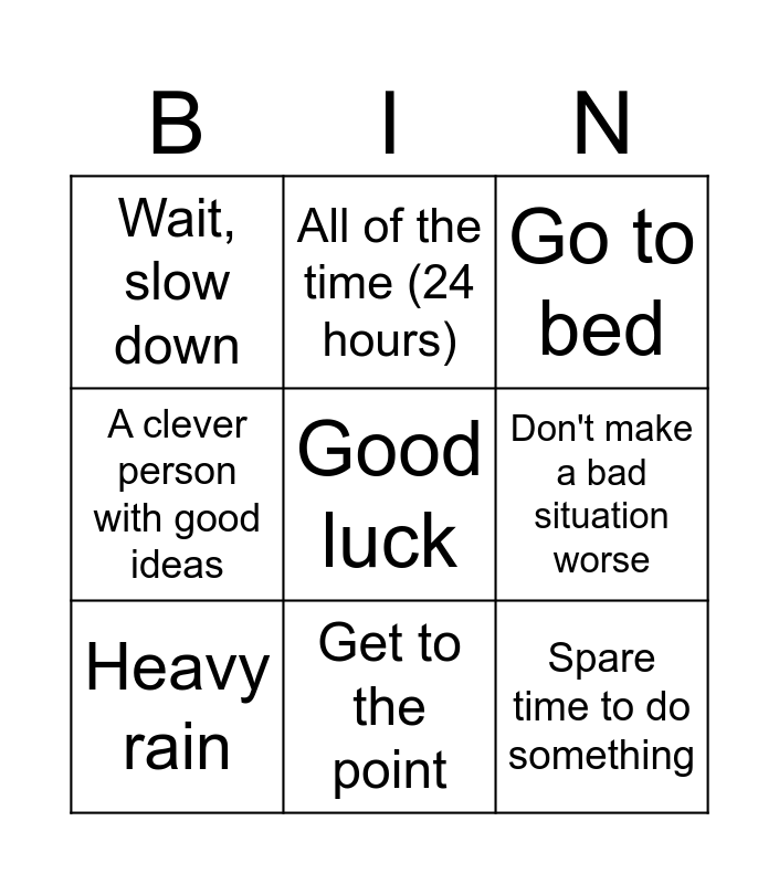 This bingo card has a free space and 8 words: Don't make a bad situation worse, Go to bed, All of the time (24 hours), Heavy rain, Wait, slow down, Spare time to do something, A clever person with good ideas and Get to the point.