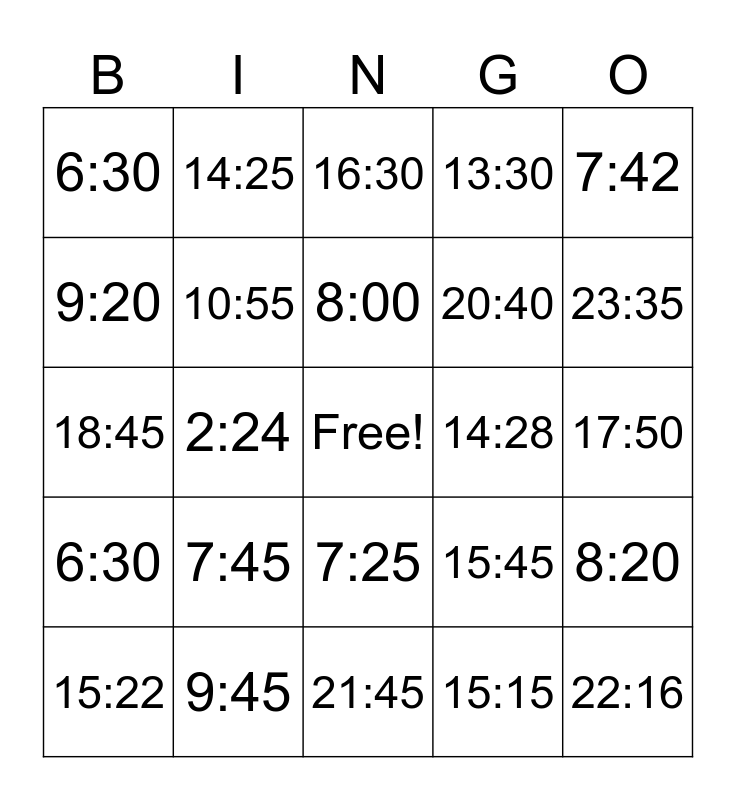 This bingo card has a free space and 24 words: 7:45, 9:45, 8:00, 15:22, 7:42, 6:30, 9:20, 14:25, 14:28, 7:25, 20:40, 18:45, 15:45, 8:20, 10:55, 15:15, 17:50, 16:30, 23:35, 2:24, 22:16, 6:30, 13:30 and 21:45.