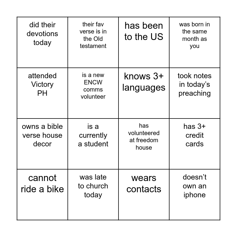 This bingo card has 25 words: is a small group leader/intern, attended Kids Church, took notes in today’s preaching, volunteers in 2+ ministries, attended Victory PH, did their devotions today, is a new ENCW comms volunteer, their fav verse is in the Old testament, was late to church today, finished Purple book class, owns a bible verse house decor, has volunteered at freedom house, doesn’t like chocolate, has pets, knows 3+ languages, is the youngest sibling, wears contacts, has been to the US, is a currently a student, has 3+ credit cards, cannot ride a bike, skipped breakfast today, doesn’t own an iphone, was born in the same month as you and is left-handed.