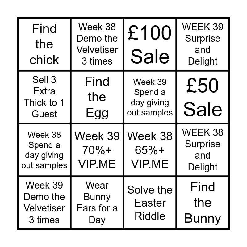This bingo card has 16 words: Wear Bunny Ears for a Day, WEEK 38 Surprise and Delight, £100 Sale, Find the chick, Week 38 Spend a day giving out samples, Week 38 Demo the Velvetiser 3 times, Week 38 65%+ VIP.ME, Solve the Easter Riddle, Sell 3 Extra Thick to 1 Guest, Find the Egg, Week 39 Demo the Velvetiser 3 times, WEEK 39 Surprise and Delight, Week 39 70%+ VIP.ME, £50 Sale, Week 39 Spend a day giving out samples and Find the Bunny.