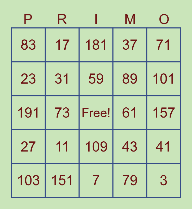 This bingo card has a free space and 46 words: 2, 3, 5, 7, 11, 13, 17, 19, 23, 29, 31, 37, 41, 43, 47, 53, 59, 61, 67, 71, 73, 79, 83, 89, 97, 101, 103, 107, 109, 27, 131, 137, 113, 139, 149, 151, 157, 163, 167, 173, 179, 181, 191, 193, 197 and 199.