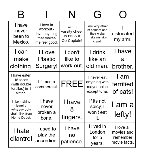 This bingo card has a free space and 24 words: I have never broken a bone., I used to play the accordion., I don't like to work out., I hate cilantro!, I dislocated my arm., I have never been to Mexico., I can make clothing., I love to workout - love anything that makes me feel good., I never eat anything with mayonnaise except tuna., I have 8 fingers., I drink like an old man., I have eaten 15 tacos (with double tortillas) in 1 sitting!, If its not spicy, I won't eat it., I am a lefty!, I Love Plastic Surgery!, I lived in London for 5 years., I am terrified of cats!, I was in varsity cheer in HS & a Co-Captain!, I have a brother., I filmed a commercial., I love all movies and remember movie facts., I like making jewelry w/heavy duty chain link from Home Depot., I am very afraid of spiders and their webs make my skin crawl. and I have no patience..