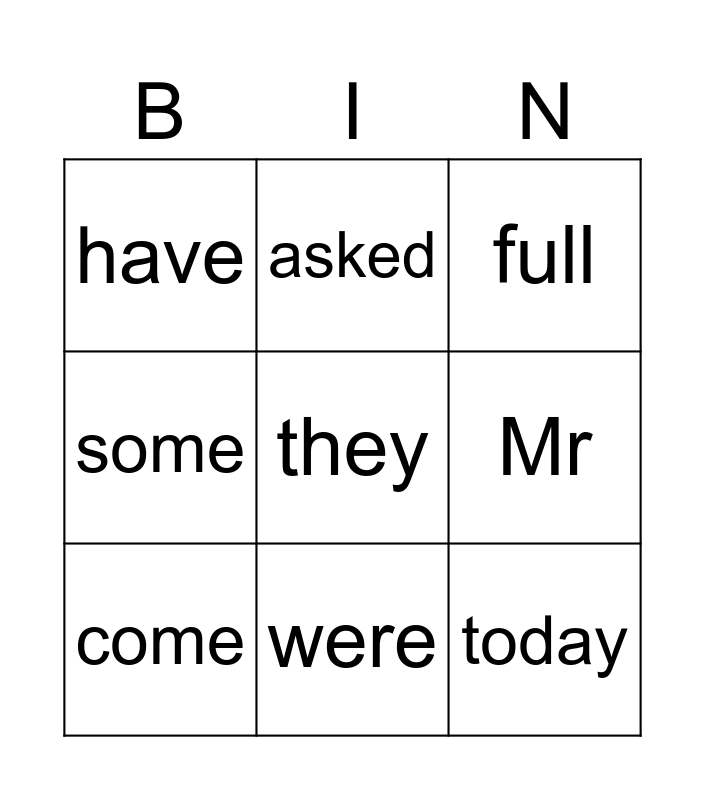 This bingo card has 36 words: your, one, oh, come, where, there, were, once, they, are, said, some, you, all, of, have, put, push, pull, full, house, our, here, says, love, asked, friend, school, today, Mr, Mrs, looked, people, called, what and their.