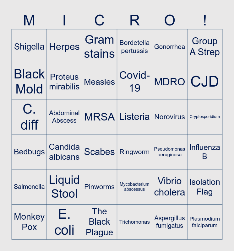 This bingo card has 42 words: Aspergillus fumigatus, Proteus mirabilis, Mycobacterium Tuberculosis, Norovirus, Influenza B, Candida albicans, C. diff, Blood cultures, Gram stains, Cryptosporidium, MRSA, Covid-19, CJD, Gonorrhea, E. coli, Bedbugs, Isolation Flag, MDRO, Plasmodium falciparum, Herpes, Group A Strep, Pinworms, Salmonella, Shigella, Brucella, Monkey Pox, Measles, Gangrene, Liquid Stool, Vibrio cholera, Sputum, Listeria, Black Mold, Pseudomonas aeruginosa, The Black Plague, Scabes, Ringworm, Abdominal Abscess, Mycobacterium abscessus, Trichomonas, Bordetella pertussis and Giardia lamblia.