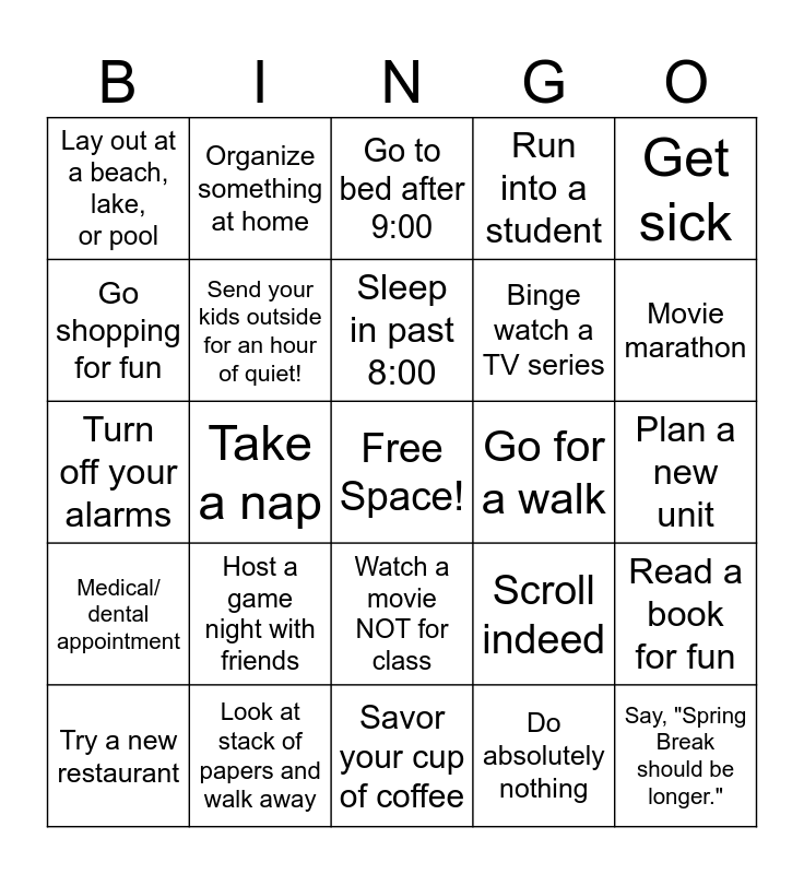 This bingo card has a free space and 24 words: Host a game night with friends, Look at stack of papers and walk away, Sleep in past 8:00, Try a new restaurant, Get sick, Lay out at a beach, lake, or pool, Go shopping for fun, Organize something at home, Go for a walk, Watch a movie NOT for class, Binge watch a TV series, Turn off your alarms, Scroll indeed, Read a book for fun, Send your kids outside for an hour of quiet!, Do absolutely nothing, Plan a new unit, Go to bed after 9:00, Movie marathon, Take a nap, Say, "Spring Break should be longer.", Medical/ dental appointment, Run into a student and Savor your cup of coffee.