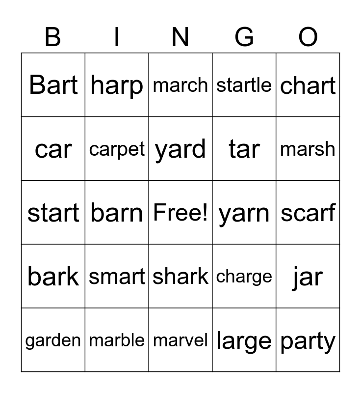 This bingo card has a free space and 34 words: artist, large, starch, gargle, bark, carpet, chart, garden, harp, bar, yard, march, harsh, dart, yarn, marsh, marble, start, smart, charge, shark, market, Bart, scarf, marvel, party, startle, spark, tar, car, card, barn, jar and lard.