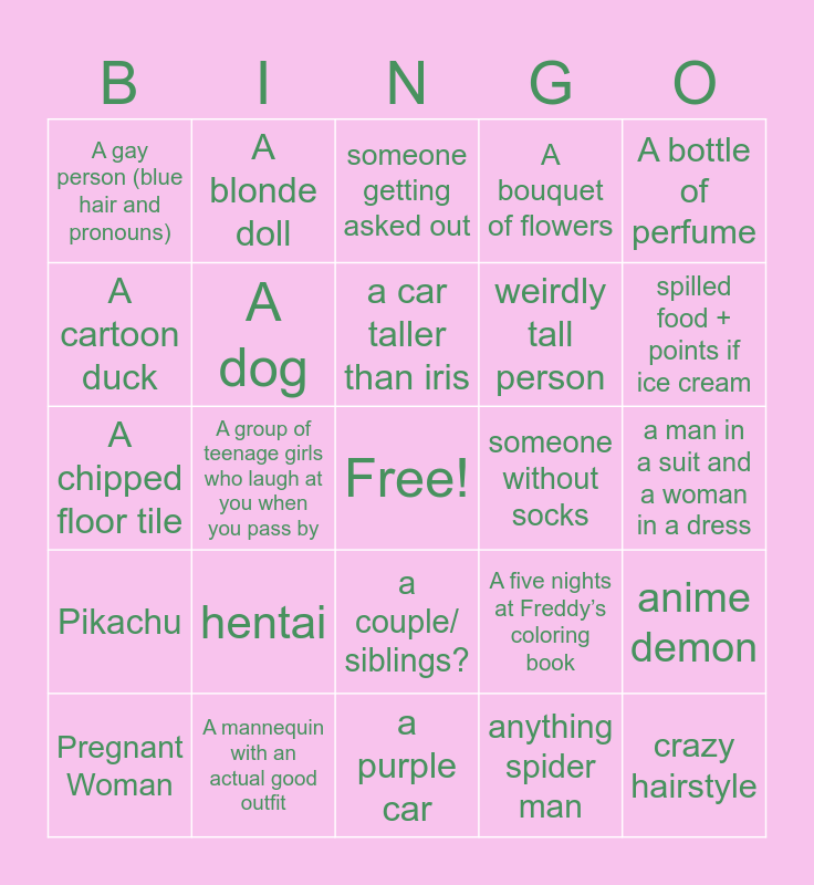 This bingo card has a free space and 29 words: Pregnant Woman, Someone wearing crocs, A group of teenage girls who laugh at you when you pass by, A hot pink shoe, A gay person (blue hair and pronouns), someone getting asked out, A dog, hentai, someone without socks, A mannequin with an actual good outfit, a man in a suit and a woman in a dress, crazy hairstyle, a purple car, anything spider man, spilled food + points if ice cream, recognize someone(have to know their name), a couple/ siblings?, Pikachu, A bottle of perfume, A chipped floor tile, A five nights at Freddy’s coloring book, argument, weirdly tall person, A cartoon duck, A bouquet of flowers, A blonde doll, anime demon, a car taller than iris and a child crying.