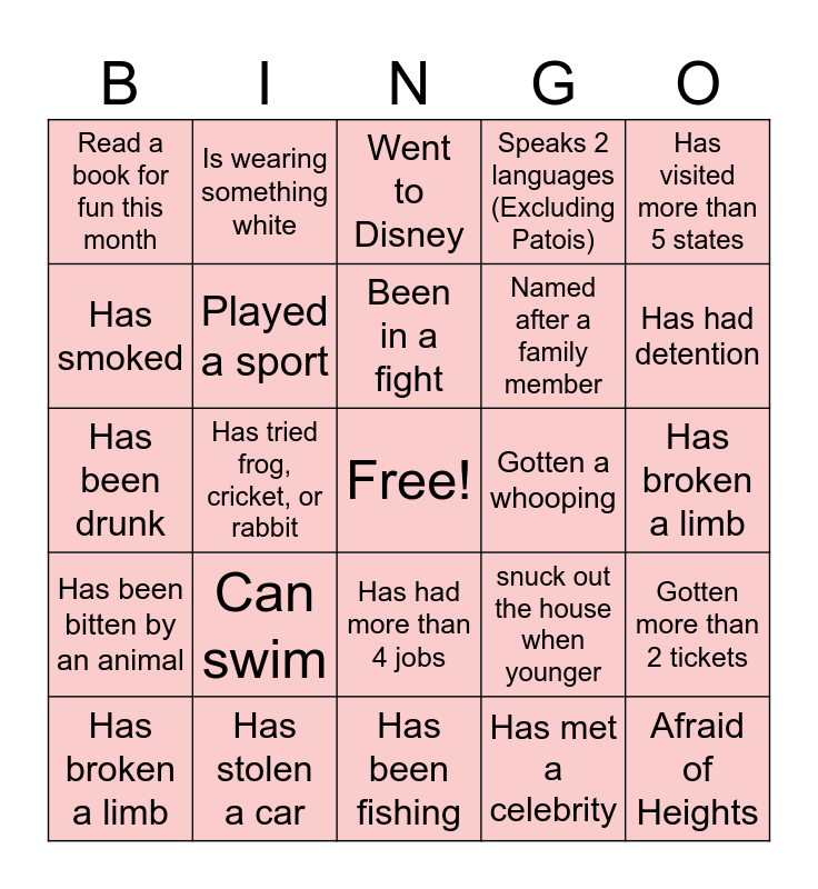This bingo card has a free space and 32 words: Has met a celebrity, Wears glasses, Has tried frog, cricket, or rabbit, Has had a pet, Has been bitten by an animal, Played a sport, Has visited more than 5 states, Gotten more than 2 tickets, Is wearing something white, Has been to Canada, Been in a fight, Went to Disney, Gotten into an accident, Is left handed, Gotten a whooping, Has had braces, Has broken a limb, Has been drunk, Has had more than 4 jobs, Can swim, snuck out the house when younger, Plays a musical Instrument, Has broken a limb, Has stolen a car, Afraid of Heights, Speaks 2 languages (Excluding Patois), Named after a family member, Has smoked, Read a book for fun this month, Has been fishing, Didn't brush their teeth this morning and Has had detention.