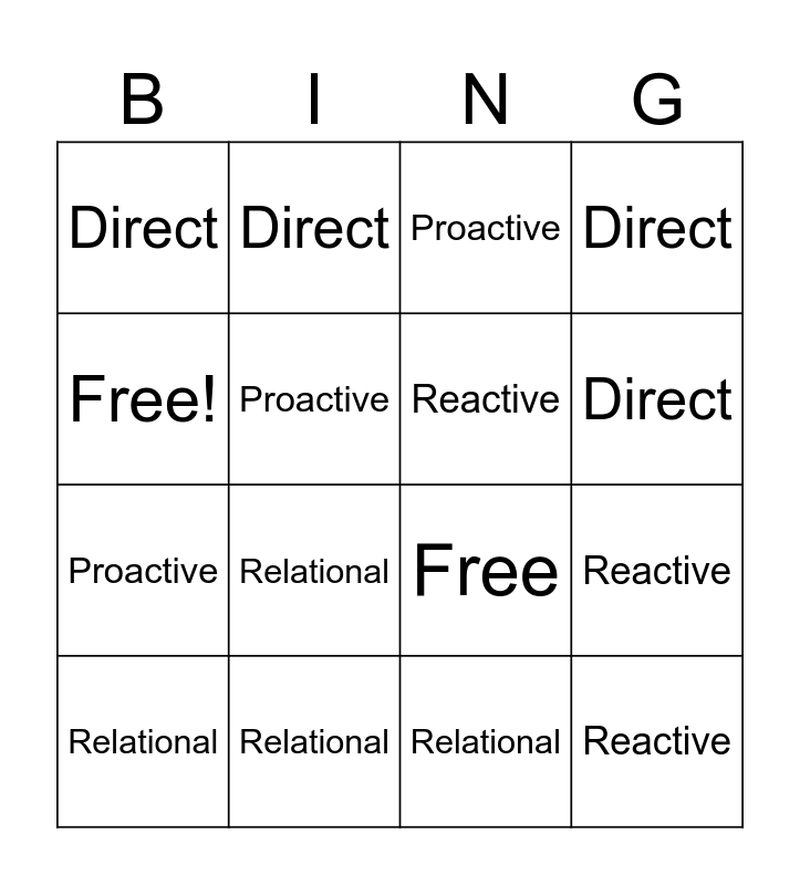 This bingo card has 16 words: Relational, Reactive, Proactive, Direct, Proactive, Direct, Free, Relational, Free!, Proactive, Relational, Direct, Relational, Direct, Reactive and Reactive.