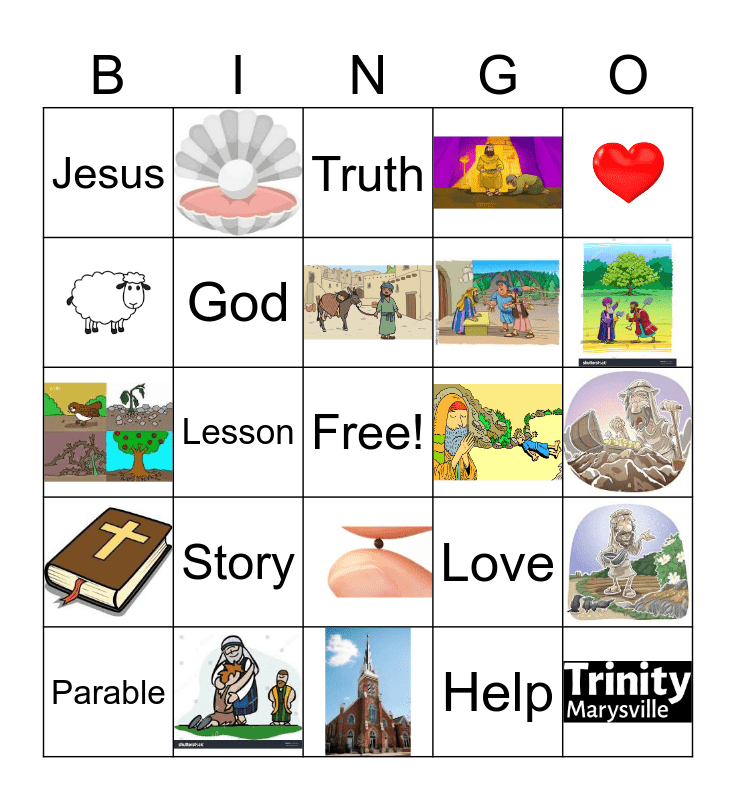 This bingo card has 16 images, a free space and 8 words: Story, Parable, Jesus, Love, God, Help, Truth and Lesson.