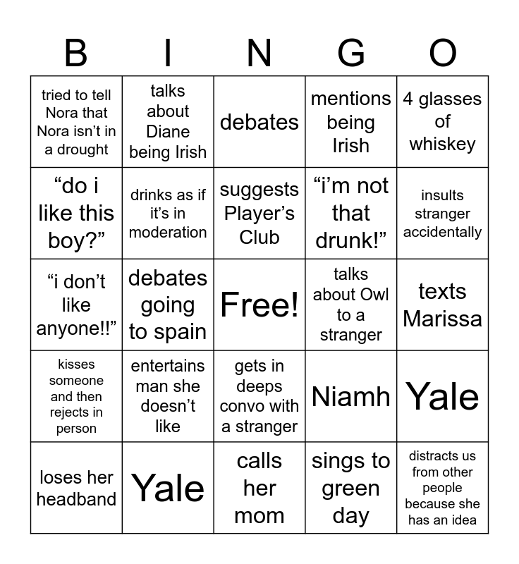This bingo card has a free space and 24 words: entertains man she doesn’t like, Yale, suggests Player’s Club, loses her headband, 4 glasses of whiskey, tried to tell Nora that Nora isn’t in a drought, “do i like this boy?”, talks about Diane being Irish, talks about Owl to a stranger, gets in deeps convo with a stranger, “i’m not that drunk!”, “i don’t like anyone!!”, Niamh, Yale, drinks as if it’s in moderation, sings to green day, texts Marissa, debates, insults stranger accidentally, debates going to spain, distracts us from other people because she has an idea, kisses someone and then rejects in person, mentions being Irish and calls her mom.