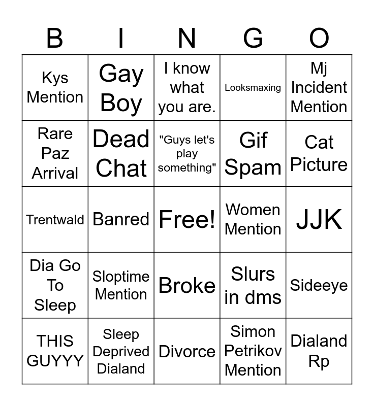This bingo card has a free space and 24 words: Sloptime Mention, Sleep Deprived Dialand, "Guys let's play something", THIS GUYYY, Mj Incident Mention, Kys Mention, Rare Paz Arrival, Gay Boy, Women Mention, Broke, Gif Spam, Trentwald, Slurs in dms, Sideeye, Dead Chat, Simon Petrikov Mention, JJK, I know what you are., Cat Picture, Banred, Dialand Rp, Dia Go To Sleep, Looksmaxing and Divorce.