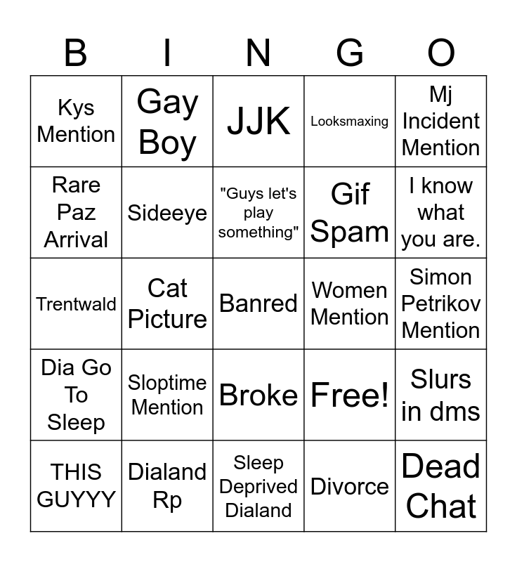This bingo card has 25 words: Sloptime Mention, Sleep Deprived Dialand, "Guys let's play something", THIS GUYYY, Mj Incident Mention, Kys Mention, Rare Paz Arrival, Gay Boy, Women Mention, Broke, Gif Spam, Trentwald, Free!, Slurs in dms, Sideeye, Dead Chat, Simon Petrikov Mention, JJK, I know what you are., Cat Picture, Banred, Dialand Rp, Dia Go To Sleep, Looksmaxing and Divorce.