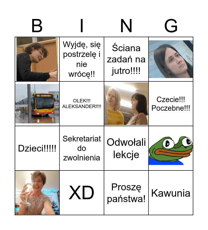 This bingo card has 6 images and 10 words: XD, Ściana zadań na jutro!!!!, Dzieci!!!!!, Wyjdę, się postrzelę i nie wrócę!!, Odwołali lekcje, Proszę państwa!, OLEK!!! ALEKSANDER!!!!, Sekretariat do zwolnienia, Czecie!!! Poczebne!!! and Kawunia.