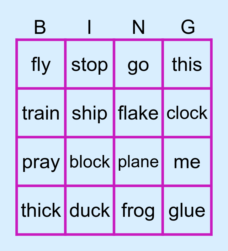 This bingo card has 16 words: duck, me, go, fly, pray, stop, plane, frog, train, ship, thick, this, block, clock, flake and glue.